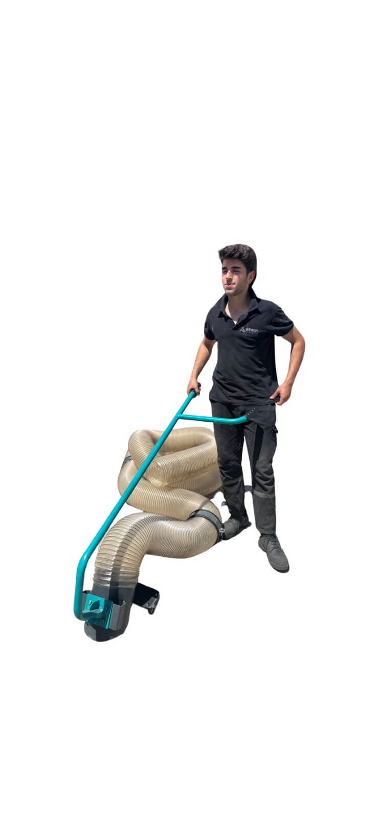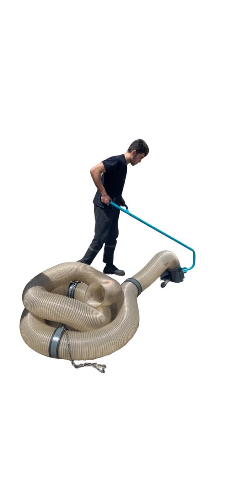 Makine; uzun ömürlü kullanım için Hardox malzemeden üretilmiş fan, duvar ve kanatlarla donatılmıştır. Özel tasarımlara uygun olarak Hardox kaplama opsiyonları sunulur. 5 metre standart poliüretan hortum, ihtiyaca göre 10 metreye kadar uzatılabilir. Ayrıca destek tekerlekli özel vakum ağzı, uzun süreli temizliklerde kullanıcı konforunu artırır.